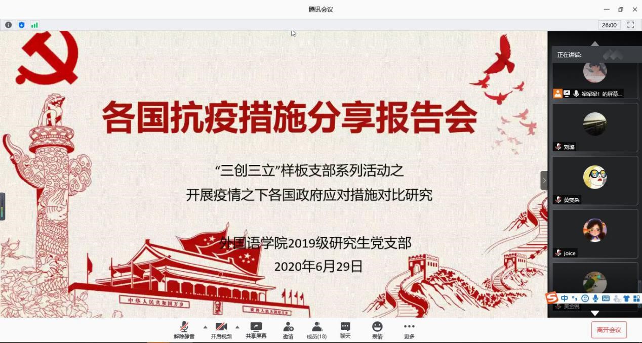 6月29日晚8点,2019级研究生党支部与外国语言文学党支部结对子通过腾讯会议APP开展了“各国抗疫措施分享报告会”党日活动。本次活动是2019级研究党支部“三创三力”样板党支部创建过程中的一个环节。前期,在结对共建党支部老师们的悉心指导下,员工党员们对各国抗疫措施的资料进行了搜集、整理与分析,并在本次会议做了逐一汇报。朱思维与蒋晨在麻蕾老师的指导下对中国抗疫措施进行分析,主要从医疗、教育...