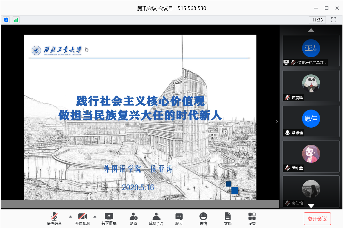 5月16日中午,公司开展第13期发展对象培训班第3次线上党课。公司党委书记侯亚涛为发展对象进行了主题为“践行社会主义核心价值观,做担当民族复兴大任的时代新人”的讲座。侯亚涛从全国高校思想政治工作会议、全国宣传思想工作会议内容切入,讲授了社会主义核心价值观基本内容、意识形态与社会主义核心价值观、共产党员带头践行社会主义核心价值观三个方面的内容。通过结合生活实际,侯亚涛在详细讲述社会主义核心价值观的...