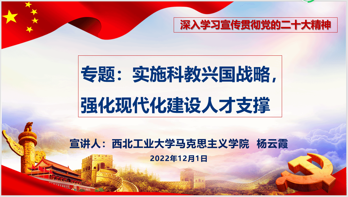 杨云霞以“实施科教兴国战略,强化现代化人才建设支撑”为题,从党的二十大报告中教育、科技、人才三大战略切入,利用详尽数据解读了步入新时代这10年以来,我国科技领域的伟大变革、面临的卡脖子问题,深刻阐释了科技自立自强对我国发展的重大意义,点明了我国教育科技人才领域面临的目标任务以及高校肩负的责任和使命,鼓励大家全面贯彻习近平新时代中国特色社会主义思想,紧跟总书记、奋进新征程,以更加强烈的历史自觉和主动精神,为全面建设社会主义现代化国家、全面推进中华民族伟大复兴而团结奋斗。