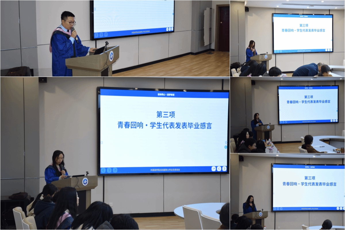 辅导员赵青介绍了本届毕业研究生的就业概况,与会同学亦逐一介绍了各自的就业方向。随后,各专业员工代表依次发言,他们结合自身经历,分享了在公司和公司的支持下,在跨文化交流、学术研究以及社会实践中的收获与感悟,以及从迷茫困惑到从容成熟的蜕变历程,表达了对母校培育、恩师教诲的感激之情。