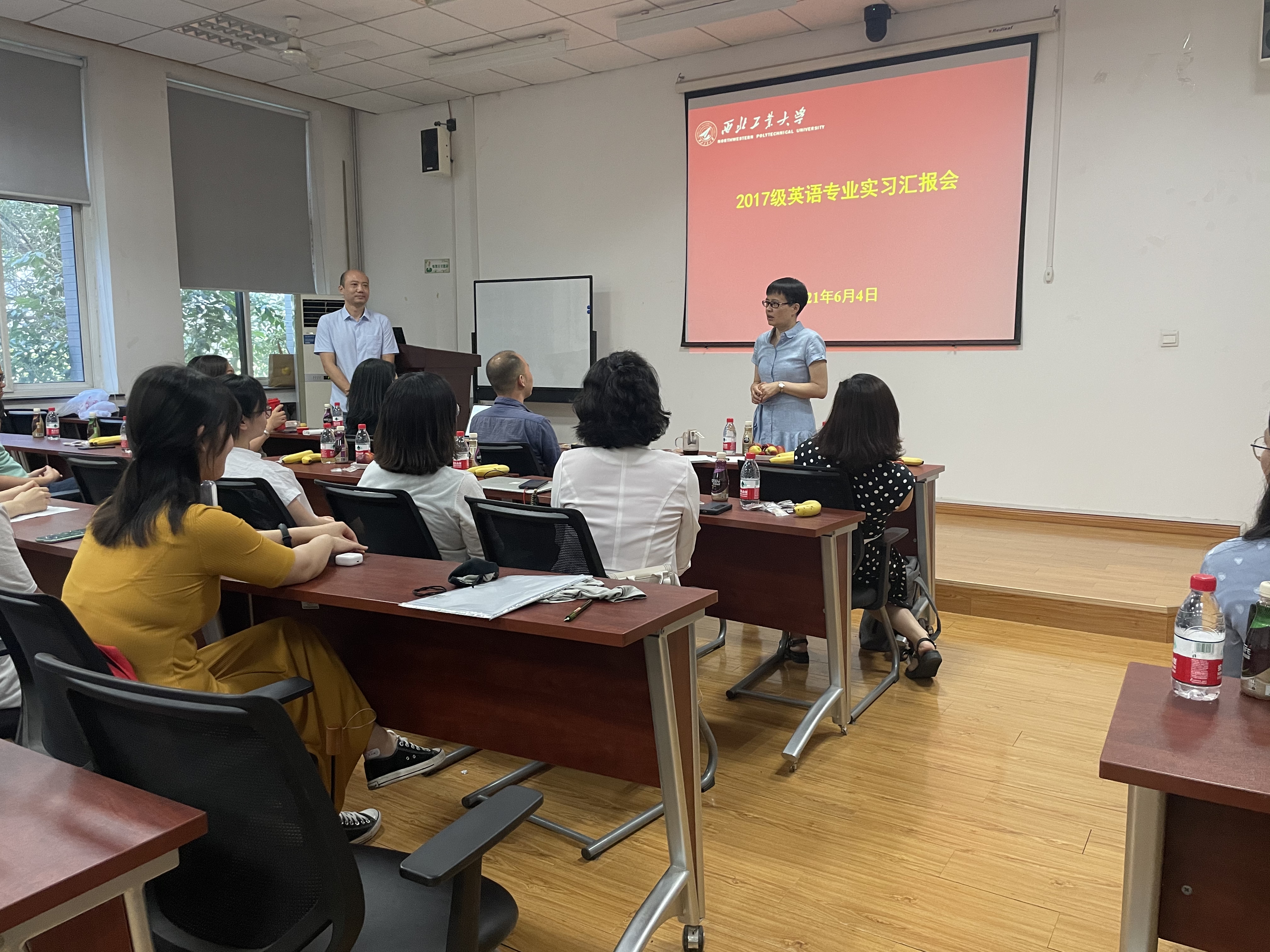 6月4日,2017级英语专业本科毕业生实习汇报会在公司204教室举行。英语国家级一流专业建设点负责人张奕教授、外国语言文学系主任李利敏副教授、英语专业负责人刘菲副教授及全体专业教师、班主任、本科教学秘书、辅导员参加了本次会议。汇报会由班主任康坛老师主持。
