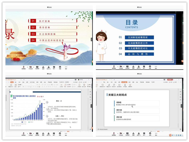 朱思维与蒋晨在麻蕾老师的指导下对中国抗疫措施进行分析,主要从医疗、教育、社会保障三方面的措施开展研究,最后总结中国态度与制度优势。黄奕采和吴红丽在李倩瑗老师的指导下对美国抗疫措施进行分析,介绍了美国疫情现状、美国科技社团在疫情期间的表现、中美两国的防疫状况不同,最后进行总结以及分享感悟。韩若冰、胡静娴和陈引弟在阮红梅老师的指导下对意大利防疫状况进行分析,主要从意大利疫情动态、疫情严重的原因、疫情期间的经济与生活及政府的应对措施四方面进行了分享。刘璐和朱辰在王琳老师的指导下对德国防疫状况进行分析,主要从政府与民众两方面进行分享。政府方面主要介绍了德国政府面对疫情的相关措施,民众方面主要介绍了疫情期间德国民众的家庭、工作与社交。