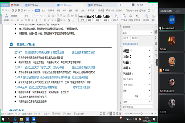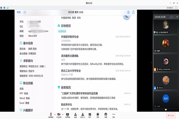 为提高公司员工简历制作的水平,提早培养员工制作简历的意识和能力,公司于7月16日至18日在2018级55名本科生中策划了一场简历制作大赛。党委副书记高敏、班主任王譞、赵飒飒、王勇、兼职辅导员张暖希以及3位员工评委吴佳丽、贾璠、赵振华担任本次比赛的评委。由于受疫情影响,本次比赛以班级为单位,全程采用腾讯会议平台在线进行。