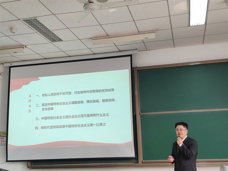 一段承载历史记忆的视频拉开了此次党课的序幕,本次党课包含两部分内容:党和人民历经千辛万苦,付出各种代价取得的宝贵成就;坚定中国特色社会主义道路自信、理论自信、制度自信、文化自信。杨晓从近代以来中国面临的内忧外患讲起,讲述了在中国建设发展的过程中国内、国际的环境对中国特色社会主义道路完善的影响。他强调,方向决定道路,道路决定命运,继续坚持和发展中国特色社会主义是新时代每位共产党员需要坚守和承担的历史使命,党员同志应该对革命先烈和我们的历史心存敬畏,真正做到又专又红而不能浮于表面,不应做有损党员身份、有损中国共产党颜面的事情。