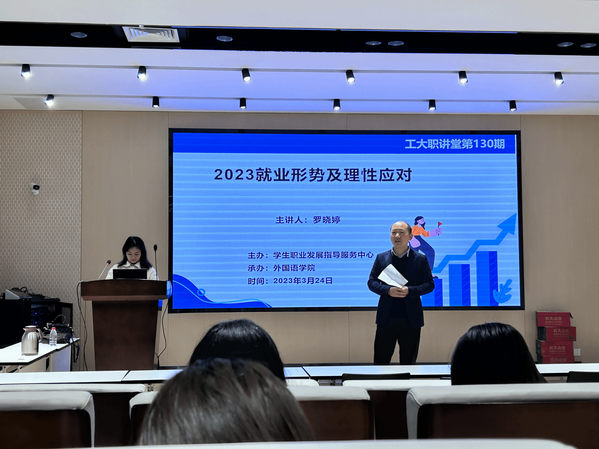 3月24日上午,第130期工大职讲堂如期举行。陕西科技大学副教授、就业创业指导部主任罗晓受邀为同学们讲授了“2023就业形势及理性应对”。在讲堂上,罗晓婷老师详细为同学们分析了当前国内的经济形势、就业形势以及如何理性应对这一现状,为毕业生们求职提供了新方向和新思路。