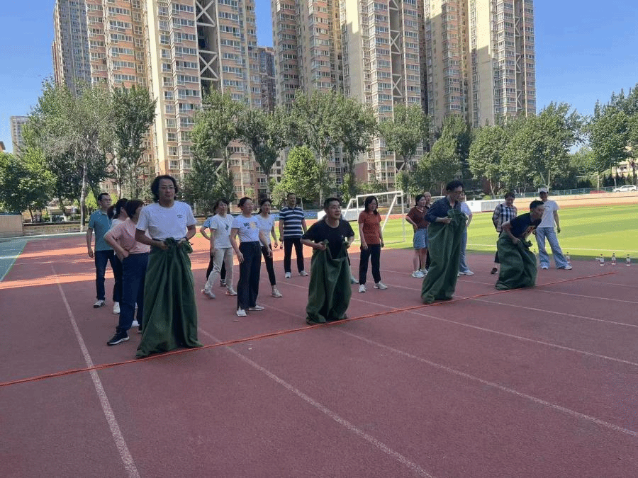 跳袋赛跑:参赛共有四个队伍,每队五个人,站在队伍前面的男老师们装在绿色袋子里,时而大步跳跃,时而快步移动,老师们干练的动作赢得观赛老师们阵阵掌声和欢乐笑声。