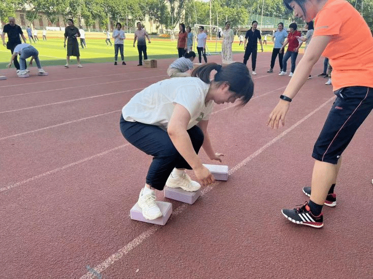 摸石过河:瑜伽砖变成了河里的石头,亦是老师们过河的垫脚石。每个老师各使妙招,既要保证不能掉到河里(脚不落地),同时又要快速过河。有的老师为了抓牢"石头",光脚踩到石头上; 有的侧身前行;有的前后挪行。每个参与者不同的动作惹得众人捧腹大笑,他们又不断地加油鼓励。