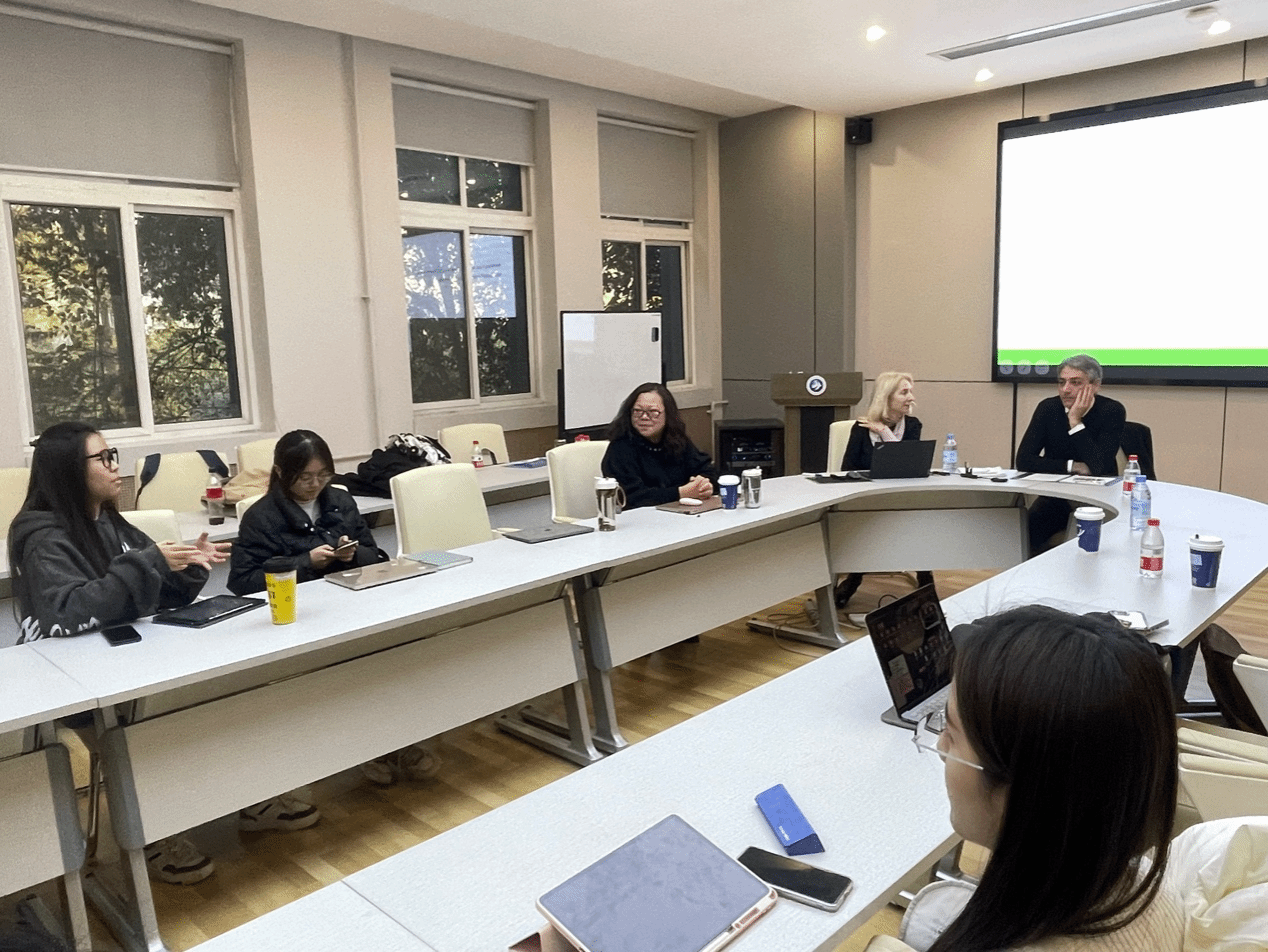 报告结束后,两位学者与公司师生面对面进行了深入交流。公司研究生导师在外语专业教学与新技术融合及人才培养方面作了实践教学经验分享;同学们也从研究背景、内容及方法论等角度出发,积极向两位英方老师探讨学习。研讨会氛围轻松愉快,双方就中英学术前沿问题展开了热烈讨论,碰撞出思想的火花。
