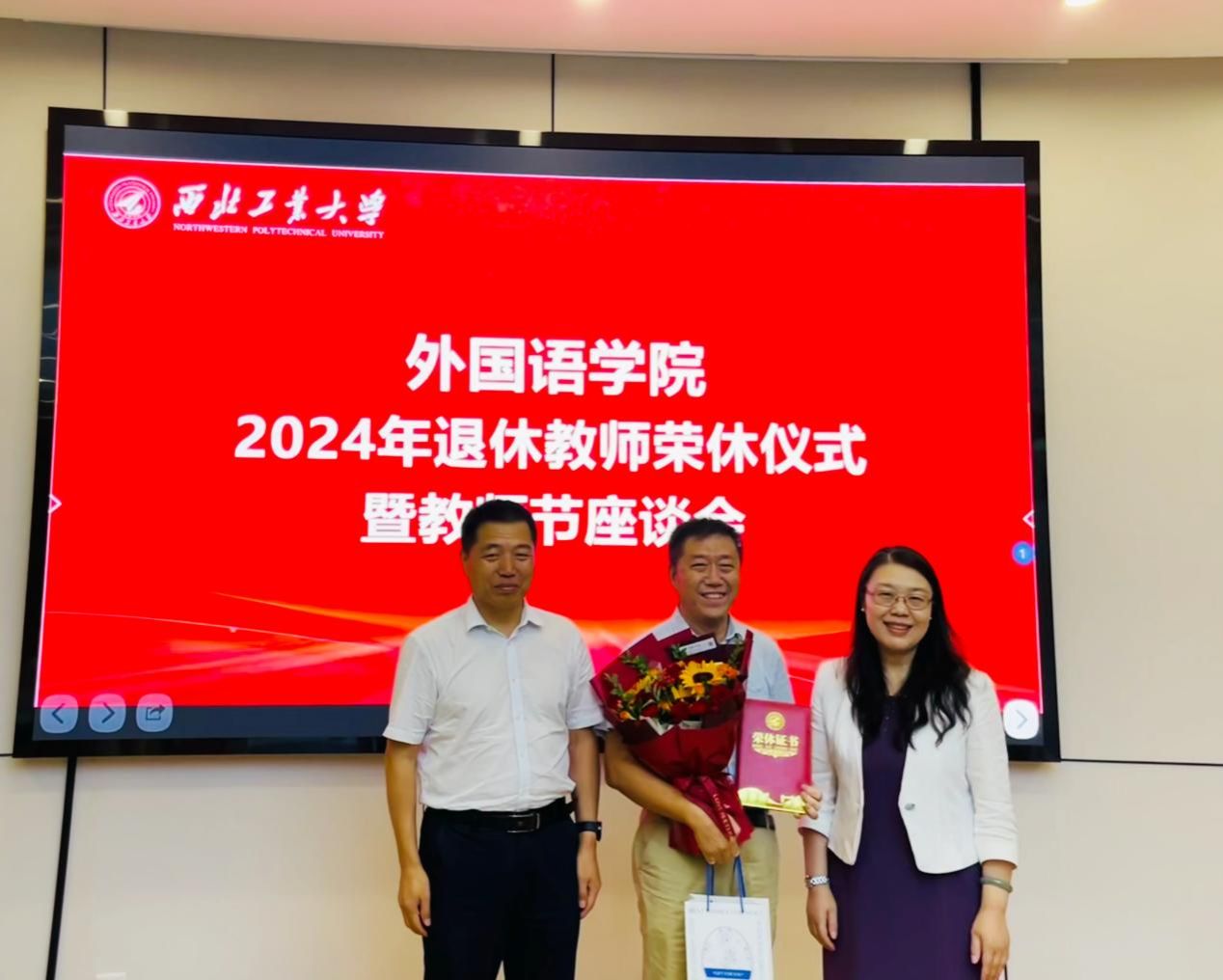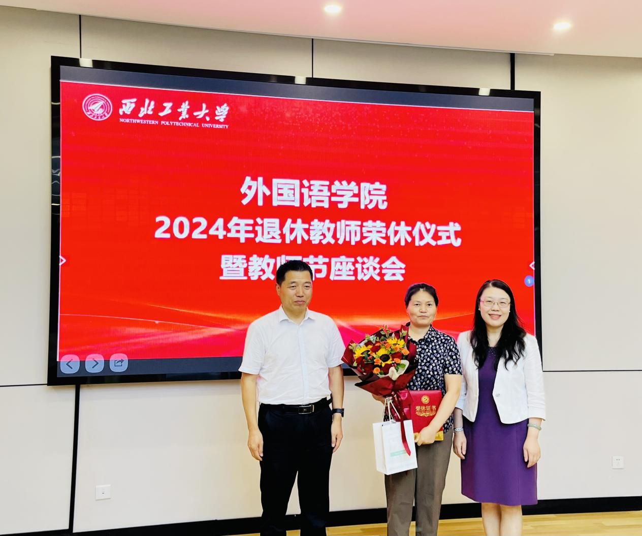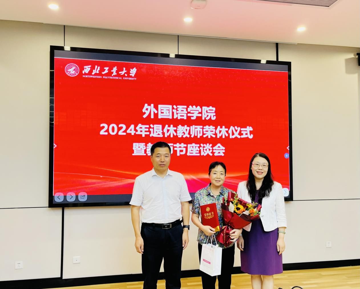 公司领导孙瑜、王高祖共同为三位教师颁发了荣休证书、青年师生则为老教师们献上了鲜花,表达了对退休教师的感激之情、敬佩之情和不舍之情。三位老师满怀深情地回忆了自己在公司的奋斗岁月,畅谈从教生涯的心得和感悟,感慨公司这些年取得的发展与进步,感谢公司和公司一直以来对他们教学科研工作的大力支持,也表达了对教育事业的热爱与不舍。他们鼓励与会青年教师不断钻研、接续奋斗,担负起育人育才的重任。