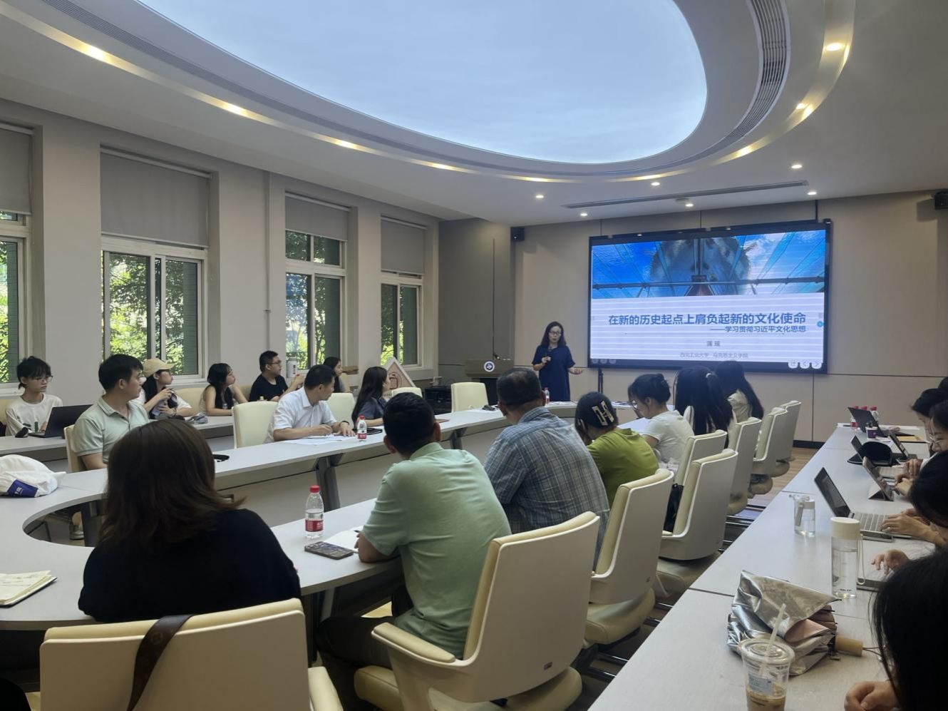 随后,蒲瑶教授以“在新的历史起点上肩负起新的文化使命-学习贯彻习近平文化思想”为题,从世情、国情、党情入手,结合外语专业,引导师生党员准确把握习近平文化思想的丰富内涵,增强对中华文化的认同感和归属感,树立文化自觉、坚定文化自信、推进文化自强。
