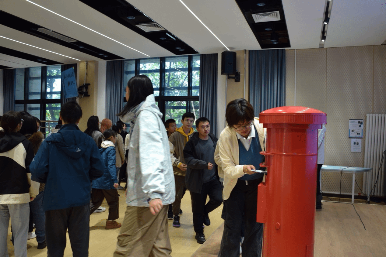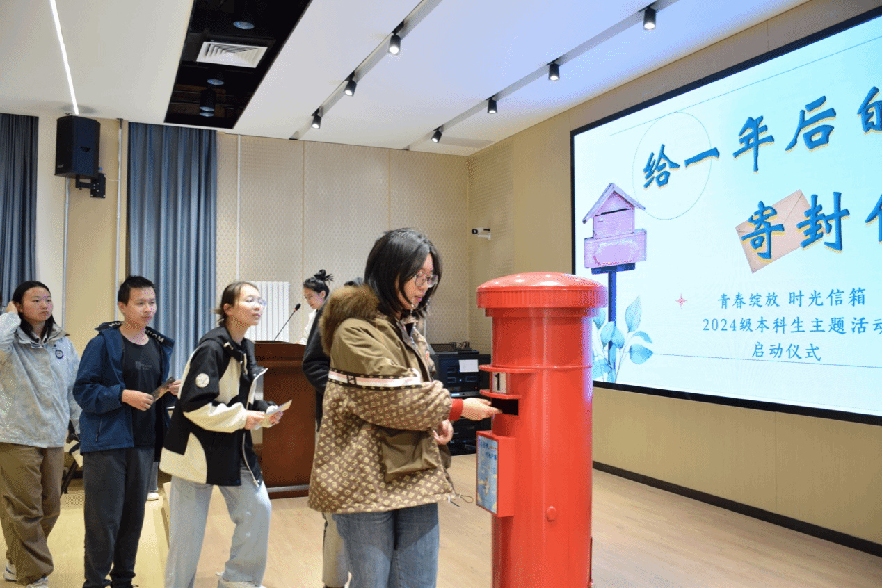 随后红色邮筒时光信箱搬上讲台,2024级本科生依次向信箱投递出《致一年后自己的一封信》。