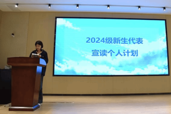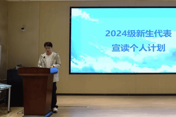 2024级三位本科生代表韩子诺、徐彪和陶宇轩走上讲台宣读个人计划。三位同学分享了各自在学业竞赛、体育运动、兴趣爱好、社会实践等层面的规划和目标,向未来的自己发出青春的宣言,活动现场响起阵阵掌声。