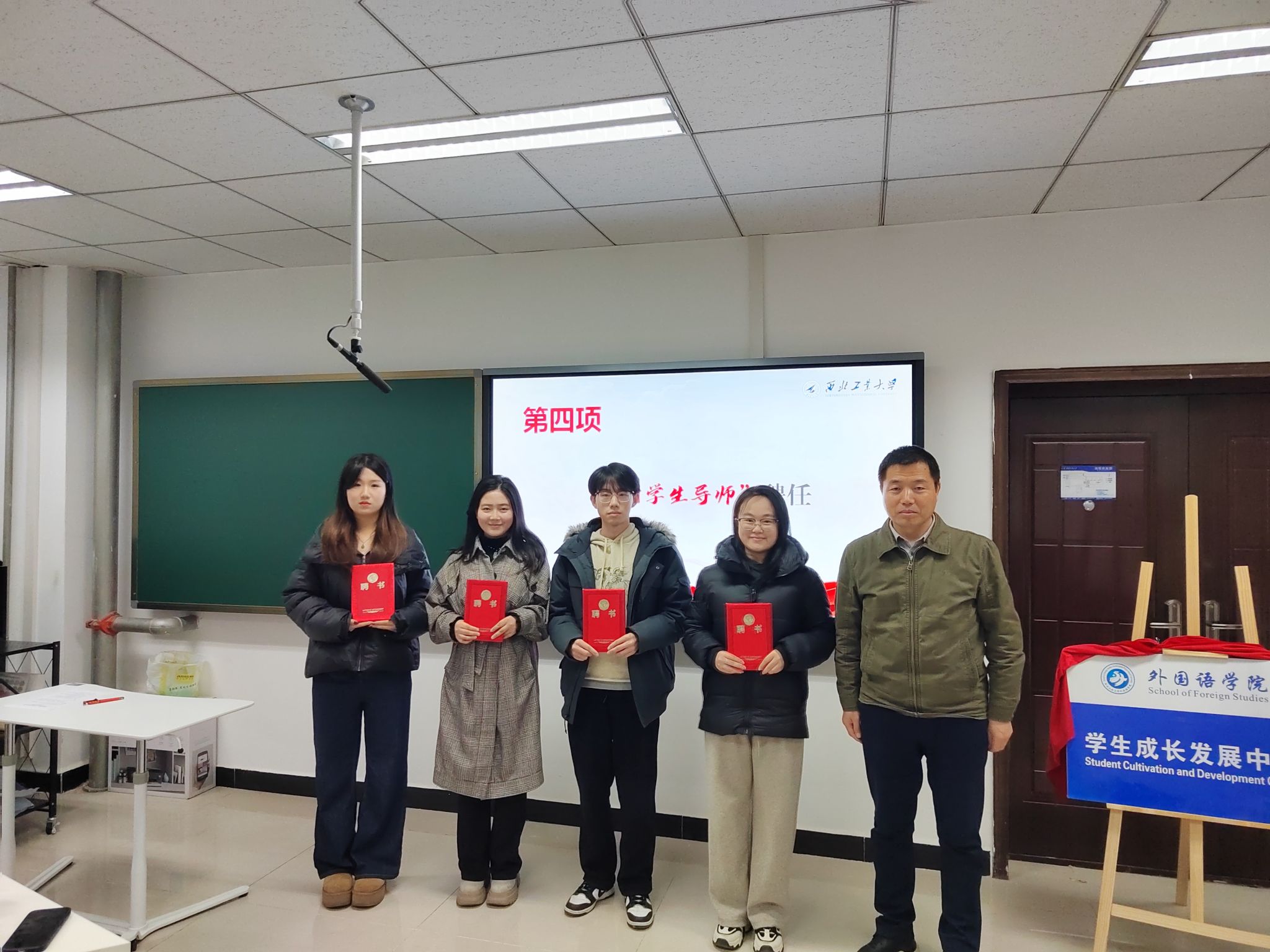 在聘任环节,张桑桑为“中心”的运维负责人李晨菲同学颁发聘书。运维负责人主要负责中心的日常管理与运营工作,并依托“中心”为公司师生提供服务。随后,王高祖为“助研员工导师”颁发聘书。助研员工导师是“中心”工作的重要内容之一,主要由研一考研上岸的员工担任,为每年大四报考本院研究生的同学提供学业帮扶。今年公司共聘任5位2024级和1位2023级优秀硕士研究生担任助研员工导师。