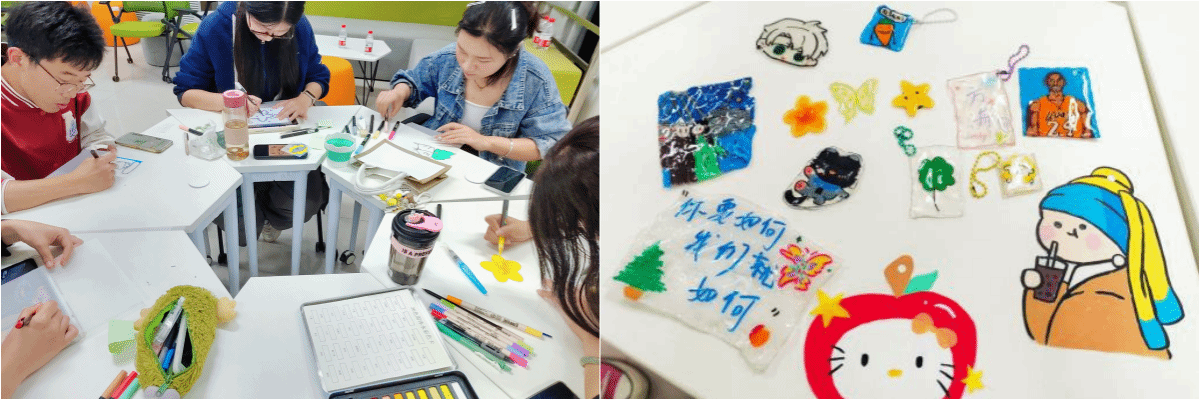 本次活动以“以美润心,以创愈心”为核心理念,围绕“艺术疗愈、情绪表达、自我成长”展开,精心设计了多个互动式、体验式、沉浸式手工项目,如“色彩情绪画”“心灵热缩片”“创意UV胶饰品”等。
