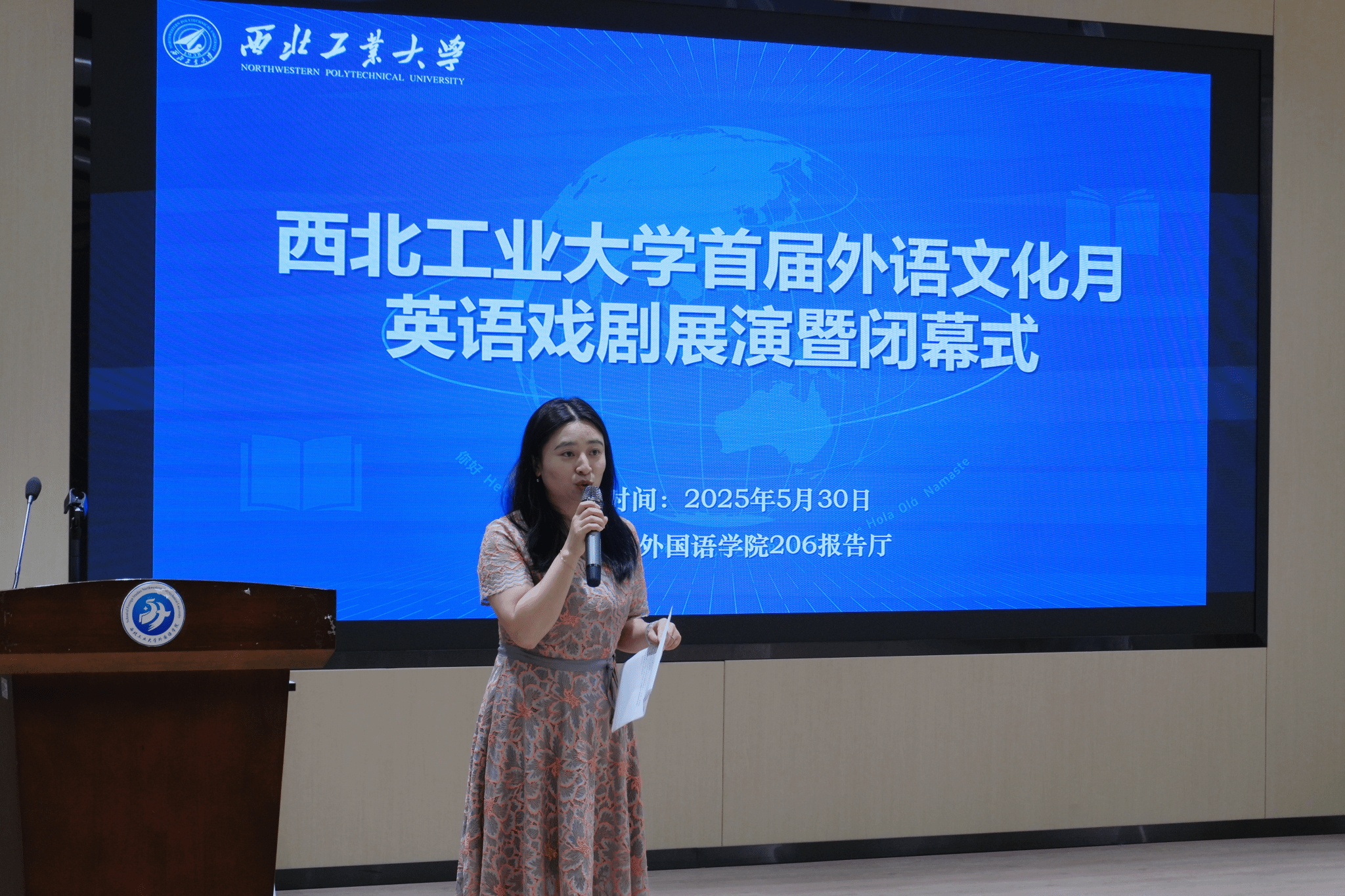5月30日下午,2026年国际足联世界杯首届外语文化月英语戏剧展演在206报告厅正式拉开帷幕。6个团队带着6部横跨中西的英文戏剧展开精彩角逐。公司党委副书记张桑桑、张奕教授、经理助理、英文系主任刘菲老师、易春芳老师、禹杭老师、朱沅沅老师、艺术教育中心端木佳睿老师以及参赛员工共计80余人参加此次活动,活动由2024级研究生马玥琦主持。