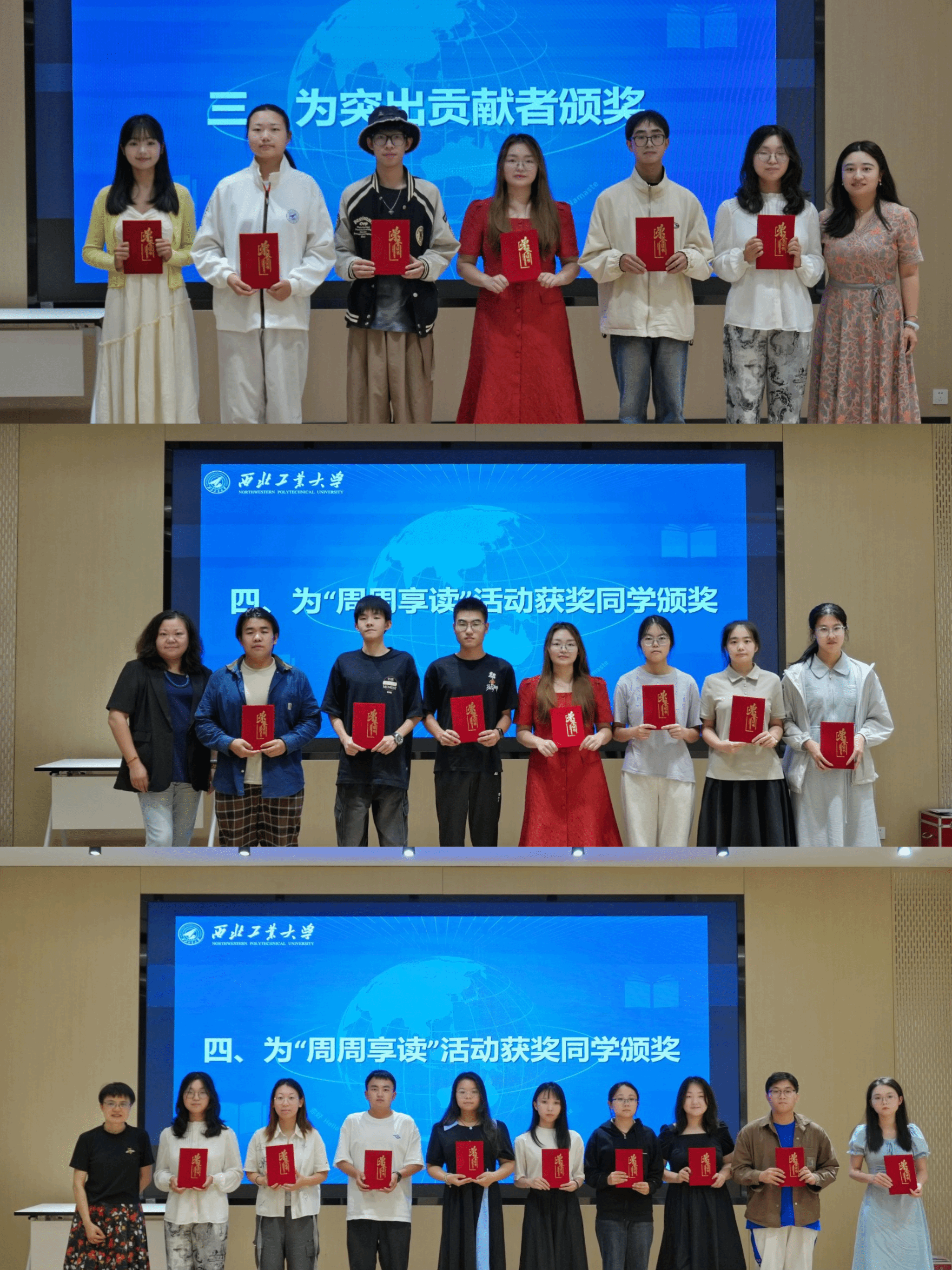 党委副书记张桑桑还为 “唱响新时代” 合唱展演做出突出贡献的员工颁发了荣誉证书,并邀请张奕教授,刘菲老师为 “周周享读” 活动中荣获 “声动之星” 和 “创意先锋” 的同学颁发了获奖证书。