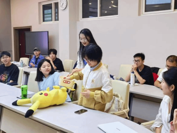 随着氛围升温,“击鼓传花”“姓名接龙”“逛三园”趣味游戏轮番上演,将活动推向高潮。“击鼓传花”环节中,玩偶在新生手中快速传递,游戏鼓点骤停时,拿到玩偶的同学抽签,完成挑战;“姓名接龙”考验大家的记忆力与反应力,重复与接力间,新生们快速记住彼此姓名与特点;“逛三园”游戏里,同学们的互动此起彼伏,错误的同学幽默“认罚”,现场笑声不断,氛围感拉满。在紧张刺激的游戏互动中,同学还能收到研会准备的种植盆栽,收纳盒等礼物。