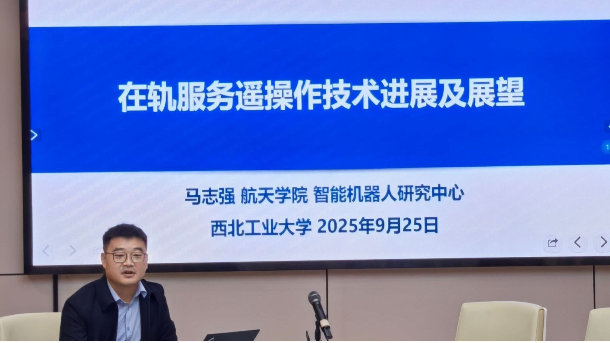 随后,马志强教授以“在轨服务遥操作技术进展及展望”为题,从大国重器入手,引导师生了解了我国在轨服务技术的战略定位和发展背景,通过动画演示与数据,直观呈现了遥操作技术在针对复杂、动态场景帮助人类实现感知和行为向远端的精准延伸和高效交互,清晰展现了我国在轨服务遥操作技术“从无到有、从有到优”的跨越式发展历程。讲座中,他还结合国内外前沿案例介绍了遥操作技术的研究现状、研究进展及未来展望。