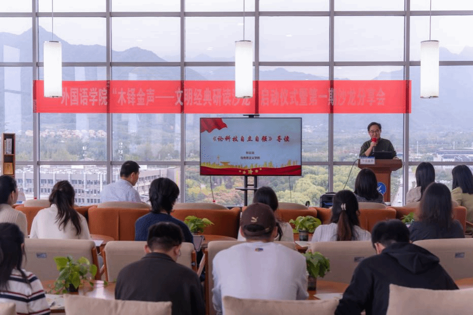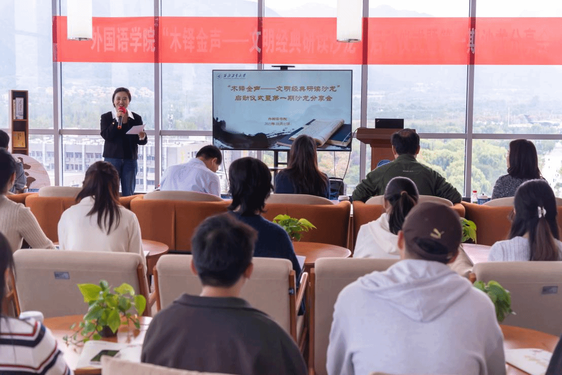 孙瑜首先对“木铎金声”的深厚意涵做了解释。她指出,“木铎”自古便是用以宣政布教、振聋发聩的响器,象征着智慧与教化;“金声”则喻指钟鼎般清越响亮、能传播久远的声音。沙龙活动以此为名,意在期望外院学子能够在导读老师的引领下,深入文明经典的堂奥,让先贤的智慧在当代焕发新的回响。孙瑜鼓励“文科员工要做‘读书人’”,并对同学们提出了三点殷切期望:一是精进专业,阅读经典是外语人治学的根基,应广泛阅读,筑牢学术根基;二是启迪思考,不仅要“读”书,更要“研”书,努力将前人的智慧转化为对自身、对时代的深刻洞察与启迪,练就独立的批判性思维能力;三是开阔见识,通过博览群书,跨越时空与文明对话,涵养广阔的文化视野与深厚的人文情怀。