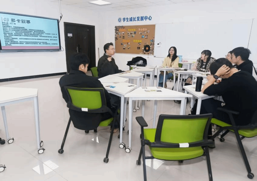 多卡叙事,从困扰到希望的自我探索。在“多卡叙事”环节中,同学们盲抽五张卡牌,依次对应“当前困扰”“理想状态”“行动路径”等主题进行讲述。借助多张卡牌的组合意义,参与者对自我处境进行了更系统的梳理,也通过倾听他人的分享获得了新的视角。该环节有效促进了同学们的情绪觉察与问题分析能力,使自我探索更加具体与深入。