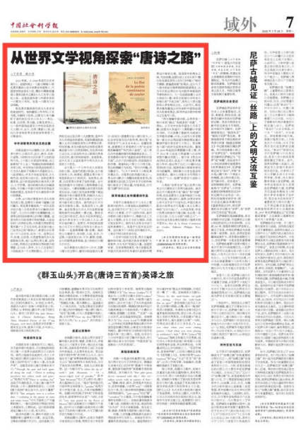 2022年7月25日,《中国社会科学报》刊发了第一作者为2021级硕士研究生丁雪莹的文章“从世界文学视角探索‘唐诗之路’”。该研究从诺贝尔文学奖得主、法国作家勒克莱齐奥与北京大学教授董强合著的《唐诗之路》出发,探索世界文学背景下的唐诗,以跨文化书写与对话视角对比分析中法作家的共同诗歌主题——酒、女性、自然,以及中西文化审美差异等方面,旨在推动中国古典诗歌走向世界,更好地传播中国文化。...